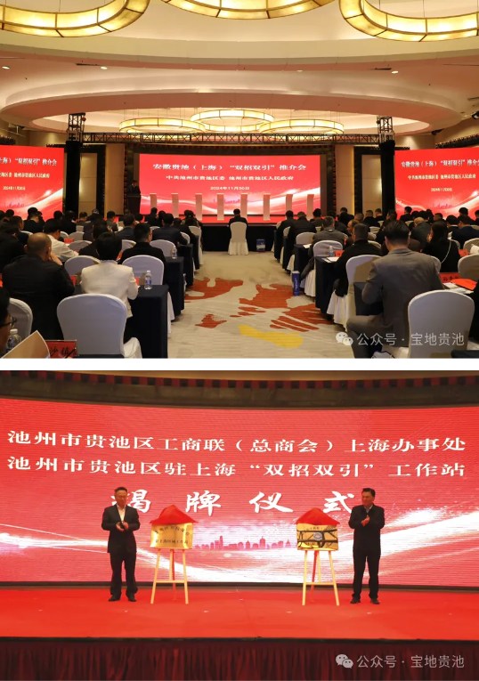11月30日上午,安徽貴池(上海)“雙招雙引”推介會在上海市松江區成功舉行。市委常委、區委書記馬勝利出席活動并現場推介貴池。中國科學院貴池籍院士、復旦大學數學科學院院長沈維孝應邀出席活動并與馬勝利一道為池州市貴池區工商聯(總商會)上海辦事處、池州市貴池區駐上海“雙招雙引”工作站揭牌。活動由區委副書記、區長錢松主持。區領導方文生、裴鈞、張亮、胡燦熔等出席活動并見證項目簽約。部分區直部門、鎮街主要負責同志參加。