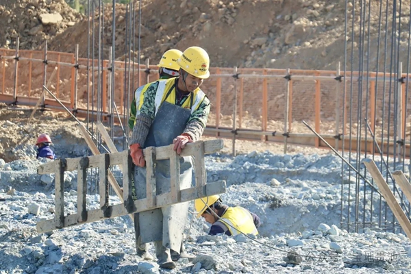 1月10日,記者在建設現場看到,數臺挖掘機和裝載車正在項目疏港道路區域協同作業,挖掘機巨大的鐵臂在空中劃出道道有力的弧線,一鏟接一鏟地將土石方挖出后迅速運往指定地點;而在辦公生活區域建設現場,工人們正忙著進行基礎連系梁的澆筑工作,混凝土從高高的輸送管中傾瀉而下,填充著鋼筋構成的框架,工人們手持振搗棒細心操作,確保每一塊區域都密實無空隙。