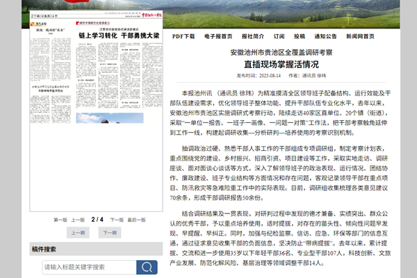 為精準摸清全區領導班子配備結構、運行效能及干部隊伍建設需求,優化領導班子整體功能、提升干部隊伍專業化水平,去年以來,安徽池州市貴池區實施調研式考察行動,陸續走訪40家區直單位、20個鎮(街道),采取“一單位一報告、一班子一畫像、一問題一對策”工作法,把干部考察觸角延伸到工作一線,構建起調研收集—分析研判—培養使用的考察識別機制。